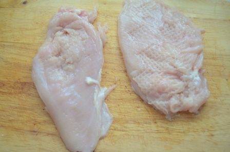 • Пока тесто стоит займемся начинкой: куриное филе помыть, отбить. Посолить, поперчить и сдобрить специями по вкусу.