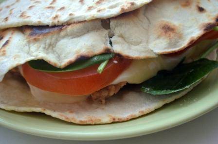 • В горячую лепешку кладем горячее филе, сверху 2 кружка моцареллы, затем помидоры и посыпаем молодым шпинатом, накрываем второй половиной и подаем.