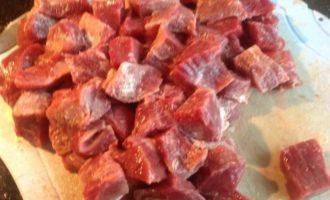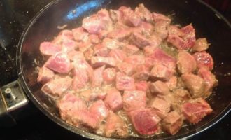 Мясо очистите от пленок, нарежьте кубиками в 1 см. Обваляйте мясо в муке и отставьте в сторону.