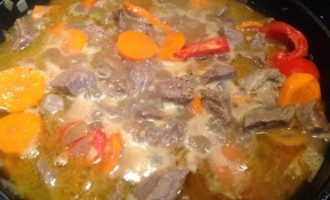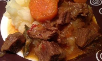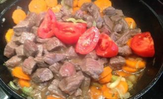 Верните в кастрюлю мясо, добавьте томаты (предварительно надрежьте, залейте кипятком на 2 мин, после чего опустите в холодную воду и очистите, нарежьте на четвертинки) и вино. Дайте жидкости немного впитаться в мясо и овощи, затем добавьте бульон (или воды), лавровые листья и немного ворчестерского соуса.