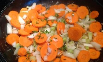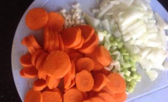 Для начала подготовим овощи: почистите лук, морковь и чеснок. Морковь нарежьте кружочками, чеснок мелко порубите, лук мелко порежьте, сельдерей крупно порубите. -