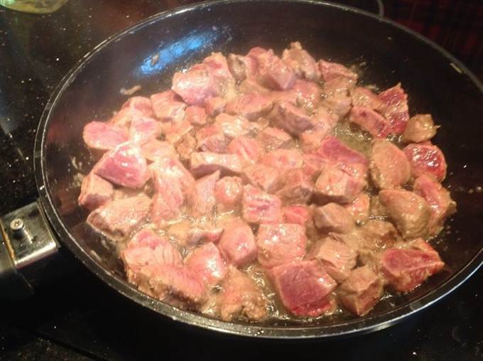 Разогрейте немного оливкового масла в тяжелой кастрюле для тушения (кассероль) и обжаривайте говядину 5 минут на среднем огне, до румяной корочки. Переложите на тарелку.