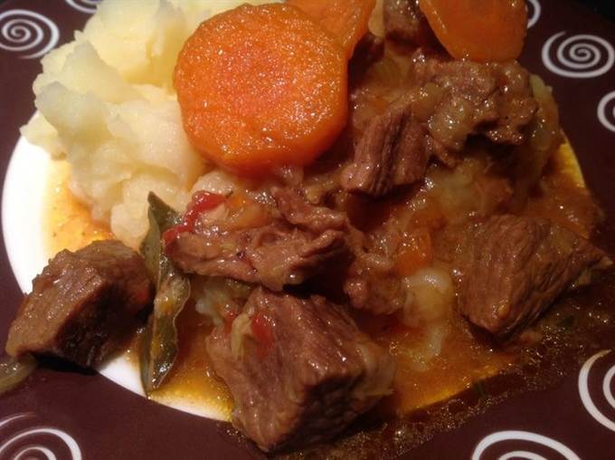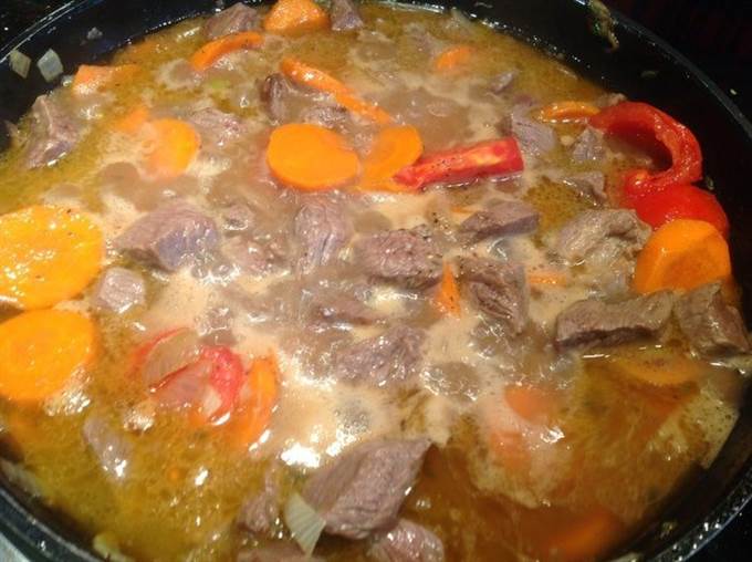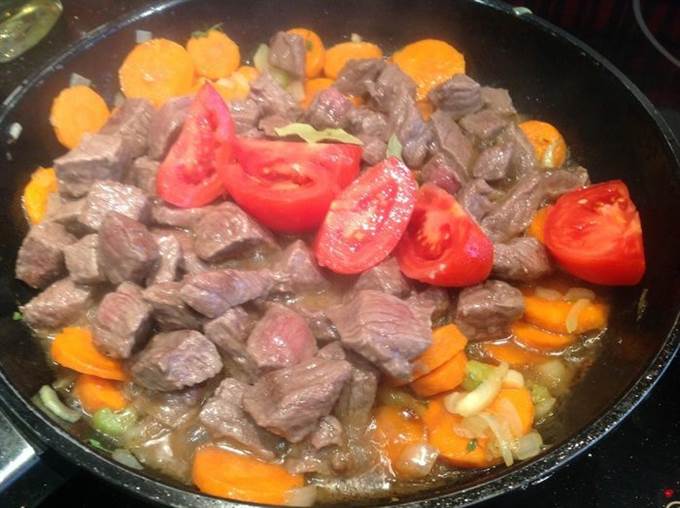 Верните в кастрюлю мясо, добавьте томаты (предварительно надрежьте, залейте кипятком на 2 мин, после чего опустите в холодную воду и очистите, нарежьте на четвертинки) и вино. Дайте жидкости немного впитаться в мясо и овощи, затем добавьте бульон (или воды), лавровые листья и немного ворчестерского соуса.