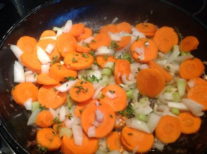 В кастрюлю добавьте еще немного масла и обжаривайте овощи вместе с листиками тимьяна, 10-15 минут до мягкости.