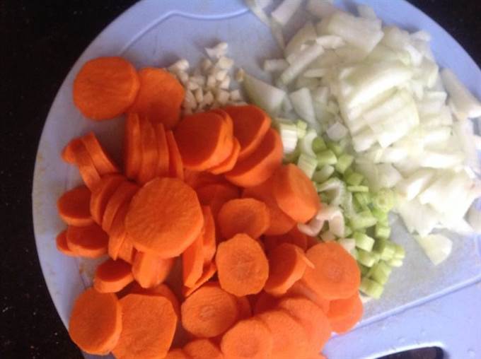 Для начала подготовим овощи: почистите лук, морковь и чеснок. Морковь нарежьте кружочками, чеснок мелко порубите, лук мелко порежьте, сельдерей крупно порубите. -
