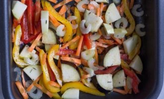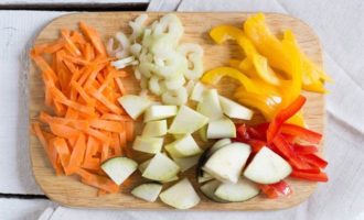 Разогрейте духовку до 200°C. Крупно нарежьте кабачок, баклажан и морковь. Порубите стебли сельдерея и тонко нарежьте красный и желтый перец.