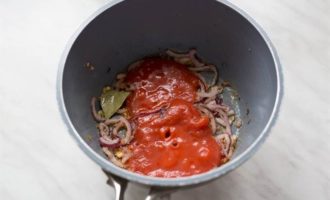 Тем временем красный лук тонко нарежьте, разогрейте оставшееся масло в сотейнике на среднем огне, выложите в него красный лук, лавровый лист, листья розмарина и муку. Перемешайте, убавьте огонь и томите 10 минут, периодически помешивая, до мягкости лука. Добавьте томатную пасту и готовьте 2 минуты.
