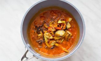 Добавьте томаты и 400 мл бульона. Доведите до кипения и тушите на небольшом огне 20 минут. Достаньте овощи из духовки, выложите в соус, перемешайте и тушите еще 10 минут.