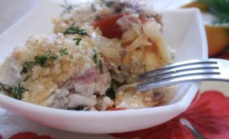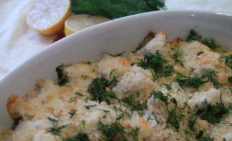 В форму положить потушенные овощи, сверху уложить рыбу, присыпать солью и перцем. Полить все сливками и засыпать равномерно хлебными крошками.