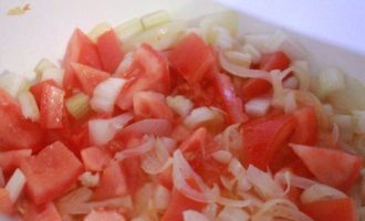 Овощи порезать. В сковороде сначала обжарить лук и чеснок, затем добавить сельдерей и помидоры. Тушить 5 минут, влить вино и еще 10 минут тушить.