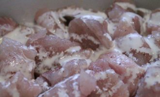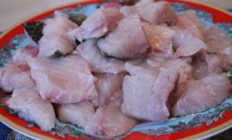 Подготовить филе и порезать кусочками на один укус.