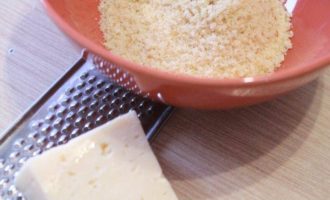 Хлеб смолоть в измельчителе до крошек, добавить натертый сыр, перемешать.