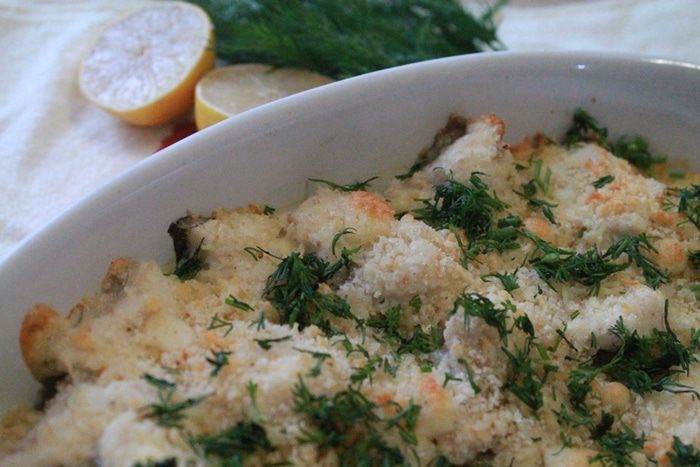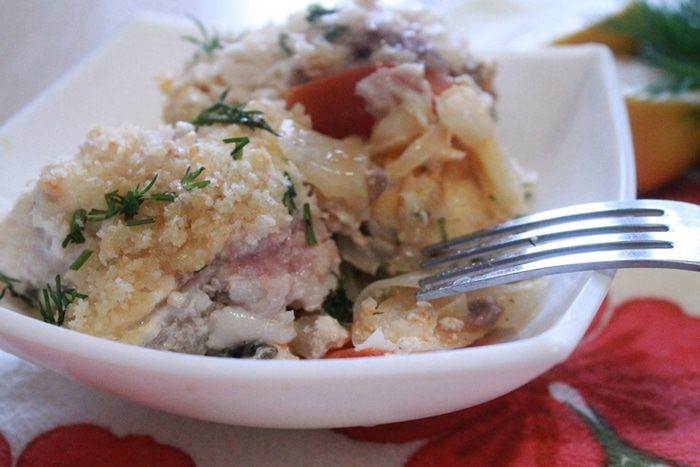 В форму положить потушенные овощи, сверху уложить рыбу, присыпать солью и перцем. Полить все сливками и засыпать равномерно хлебными крошками.