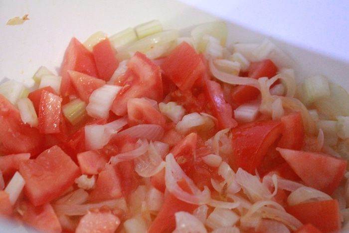 Овощи порезать. В сковороде сначала обжарить лук и чеснок, затем добавить сельдерей и помидоры. Тушить 5 минут, влить вино и еще 10 минут тушить.