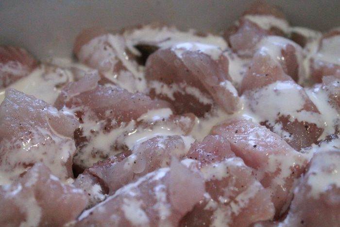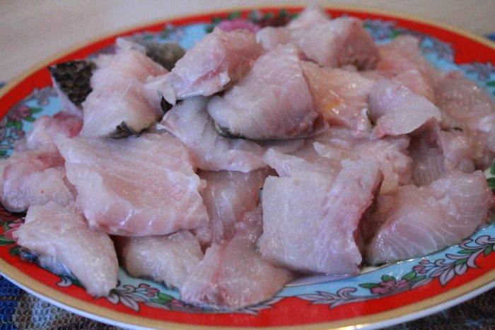 Подготовить филе и порезать кусочками на один укус.