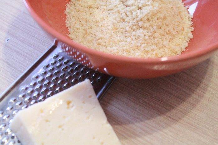 Хлеб смолоть в измельчителе до крошек, добавить натертый сыр, перемешать.