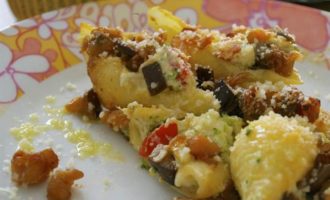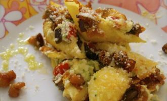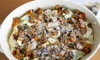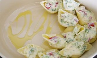 • Начинить ракушки сырно-овощной смесью, затем разложить их одним слоем на большом, смазанном маслом огнеупорном блюде.