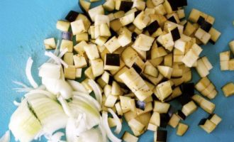Баклажан нарезать небольшими кубиками. (Кто предпочитает пересыпать нарезанный баклажан солью и дать уйти лишней горечи, может предварительно дать постоять кусочкам баклажана с солью около 1 часа, затем промыть в дуршлаге и высушить на бумажной салфетке. Я обычно пропускаю эту процедуру, мне вкус баклажана нравится таким, какой он есть). Луковицу тонко нарезать.