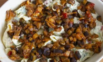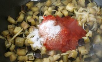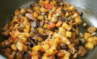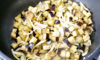 • Разогреть масло в большой сковороде и поджарить баклажаны и лук в течение 10 минут.