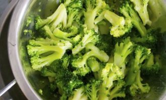 • Брокколи разделить на небольшие соцветия и бланшировать около 3 минут в кипящей воде. Слить воду и тоже отложить в сторону.