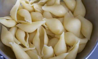• Сварить ракушечную пасту в большом количестве подсоленной воду согласно указаниям на упаковке. Не доварить буквально 2 минуты. Слить пасту и дать остыть.