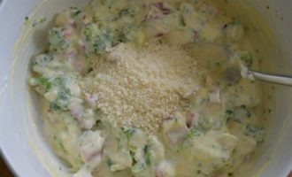 В большой миске перемешать брокколи, сыр рикотта, измельченный зубчик чеснока, красный сладкий перец, соль, взбитое яйцо, черный молотый перец и тертый сыр пармезан (2 ст.л. сыра оставить).