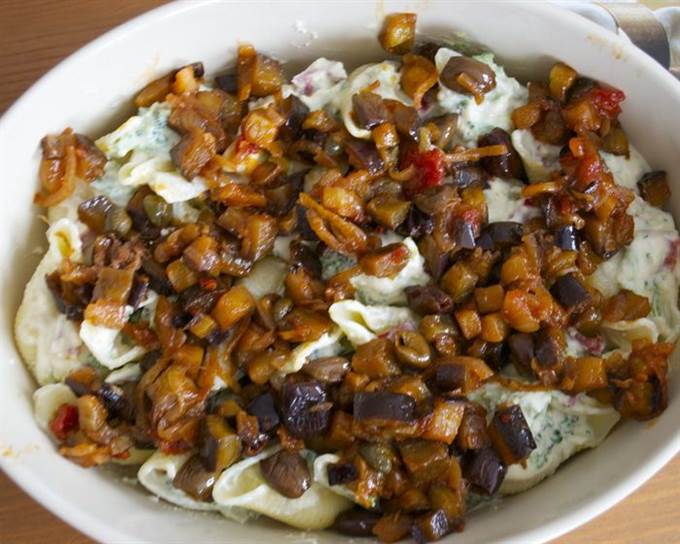 • Начинить ракушки сырно-овощной смесью, затем разложить их одним слоем на большом, смазанном маслом огнеупорном блюде.