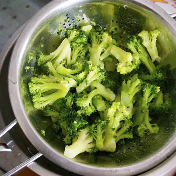 • Брокколи разделить на небольшие соцветия и бланшировать около 3 минут в кипящей воде. Слить воду и тоже отложить в сторону.