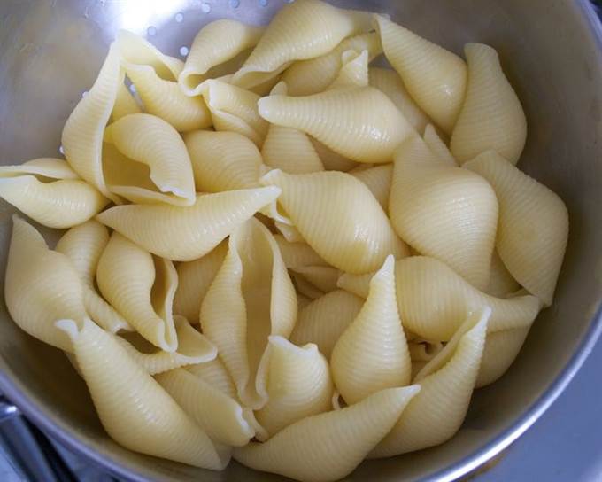 • Сварить ракушечную пасту в большом количестве подсоленной воду согласно указаниям на упаковке. Не доварить буквально 2 минуты. Слить пасту и дать остыть.
