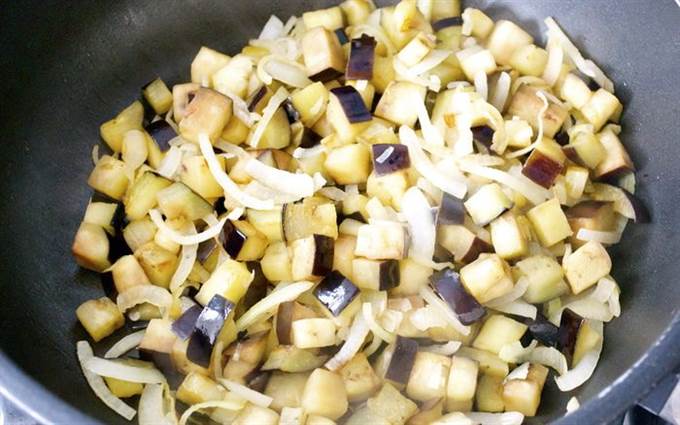 • Разогреть масло в большой сковороде и поджарить баклажаны и лук в течение 10 минут.