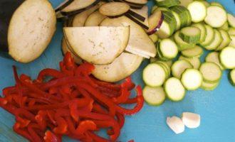 Огнеупорную форму для выпечки смазать одной столовой ложкой масла. Все овощи вымыть и подготовить… Обрезать «хвостики»/»ножки»… Кабачок и баклажан нарезать тонкими кружочками. Красный сладкий перец очистить от семян и нарезать тонкими полосками. Чеснок очистить и нарезать пластинами. -