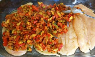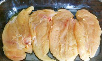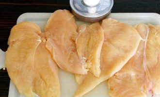 Тем временем куриную грудку нарезать (продольно) на четыре части. Слегка отбить.
