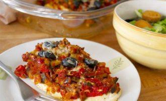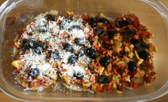 Выложить маслины и присыпать тертым острым сыром (у меня пармезан)… Поставить запекаться в разогретую духовку на 20 минут.