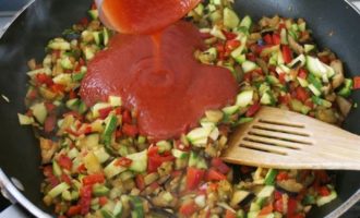 Добавить томатный соус «пассата» и томатный концентрат… Посолить, поперчить по вкусу. Добавить сушеные прованские травы, перемешать и готовить еще минут 8 на достаточно сильном огне. Овощи не должны превратиться в «кашицу».