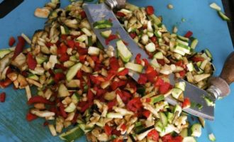 Затем собрать все овощи на большой доске и порубить, измельчить, используя нож-полумесяц… Или обыкновенным крупным ножом! Овощи при этом выдавали непередаваемый аромат свежести!