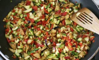 В большой сковороде разогреть оставшиеся 2 ст.л. оливкового масла и выложить овощи. Обжаривать, помешивая 2 минуты.