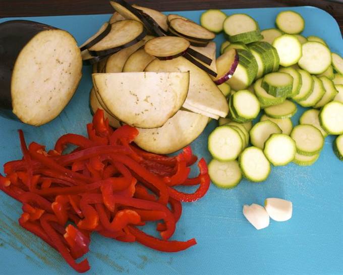 Огнеупорную форму для выпечки смазать одной столовой ложкой масла. Все овощи вымыть и подготовить… Обрезать «хвостики»/»ножки»… Кабачок и баклажан нарезать тонкими кружочками. Красный сладкий перец очистить от семян и нарезать тонкими полосками. Чеснок очистить и нарезать пластинами. -