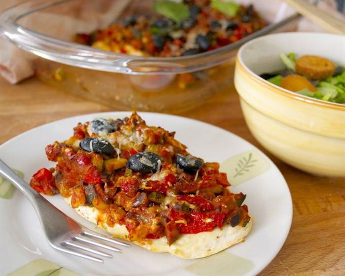 Выложить маслины и присыпать тертым острым сыром (у меня пармезан)… Поставить запекаться в разогретую духовку на 20 минут.