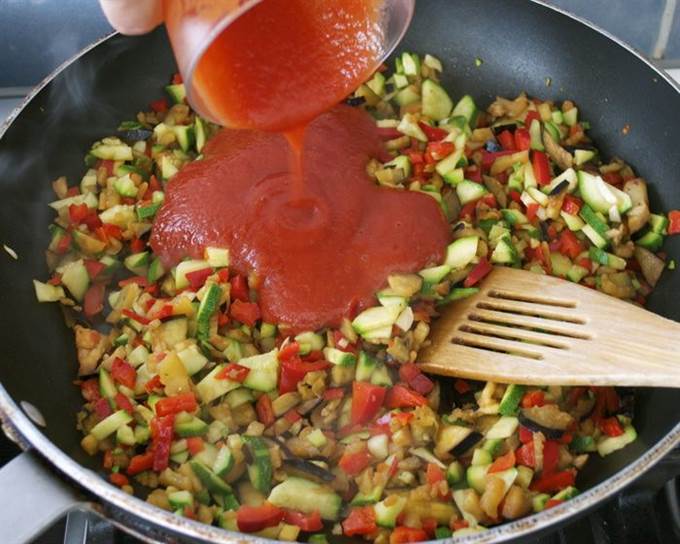Добавить томатный соус «пассата» и томатный концентрат… Посолить, поперчить по вкусу. Добавить сушеные прованские травы, перемешать и готовить еще минут 8 на достаточно сильном огне. Овощи не должны превратиться в «кашицу».