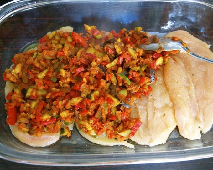 Тем временем куриную грудку нарезать (продольно) на четыре части. Слегка отбить.