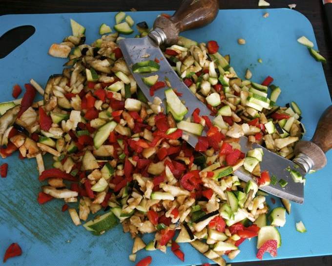 Затем собрать все овощи на большой доске и порубить, измельчить, используя нож-полумесяц… Или обыкновенным крупным ножом! Овощи при этом выдавали непередаваемый аромат свежести!