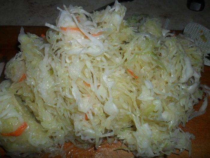 Пережариваем и добавляем квашенную капусту. Жарим помешивая.
