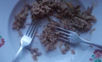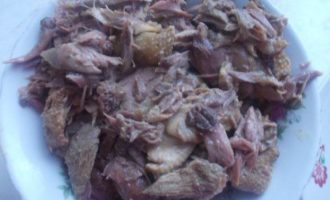 С помощью вилок разделить мясо на волокна. Затем добавить бульон, в котором варилась утка, он будет очень концентрированный и когда остынет в паштете, станет совсем крепким. Масло я не добавляла, потому-что утка и так жирная.