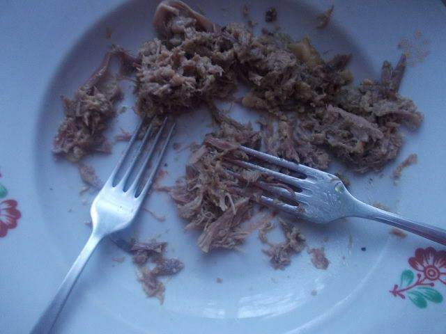 С помощью вилок разделить мясо на волокна. Затем добавить бульон, в котором варилась утка, он будет очень концентрированный и когда остынет в паштете, станет совсем крепким. Масло я не добавляла, потому-что утка и так жирная.