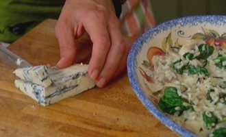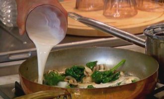• Листья шпината добавить в сковороду к грибам и немного прогреть.