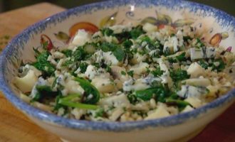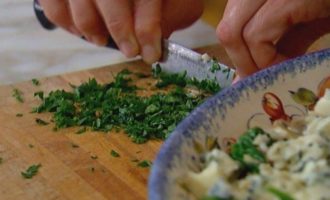 • Выложить рис на тарелку, сверху разложить кусочки сыра и посыпать петрушкой.