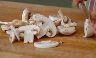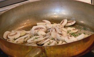 • Разогреть в сковороде оливковое масло, выложить грибы, посолить, поперчить, посыпать листьями тимьяна, перемешать и обжаривать 3-4 минуты.