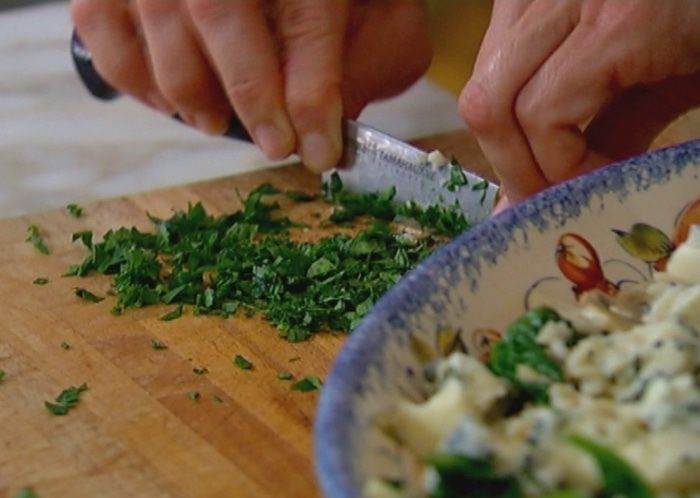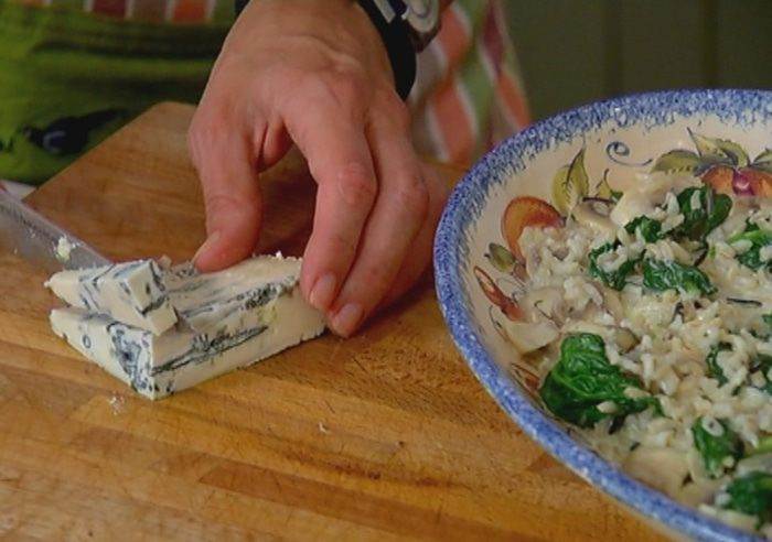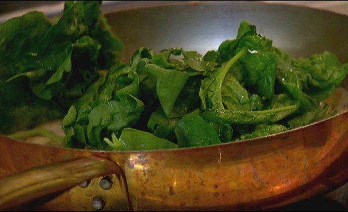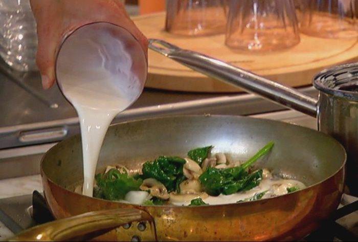 • Листья шпината добавить в сковороду к грибам и немного прогреть.