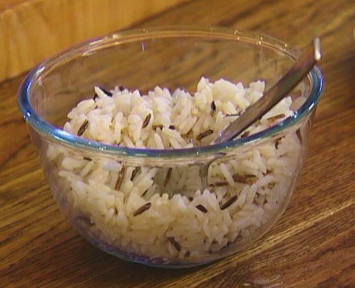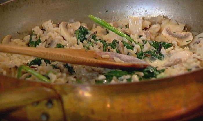 • Выложить к грибам отваренный рис, перемешать и снять сковороду с огня.