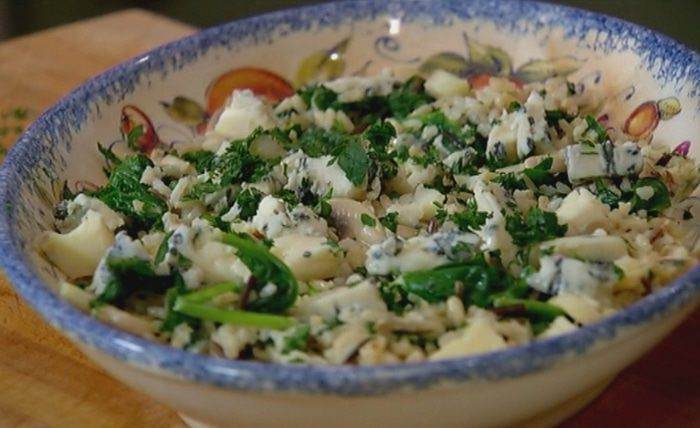 • Выложить рис на тарелку, сверху разложить кусочки сыра и посыпать петрушкой.